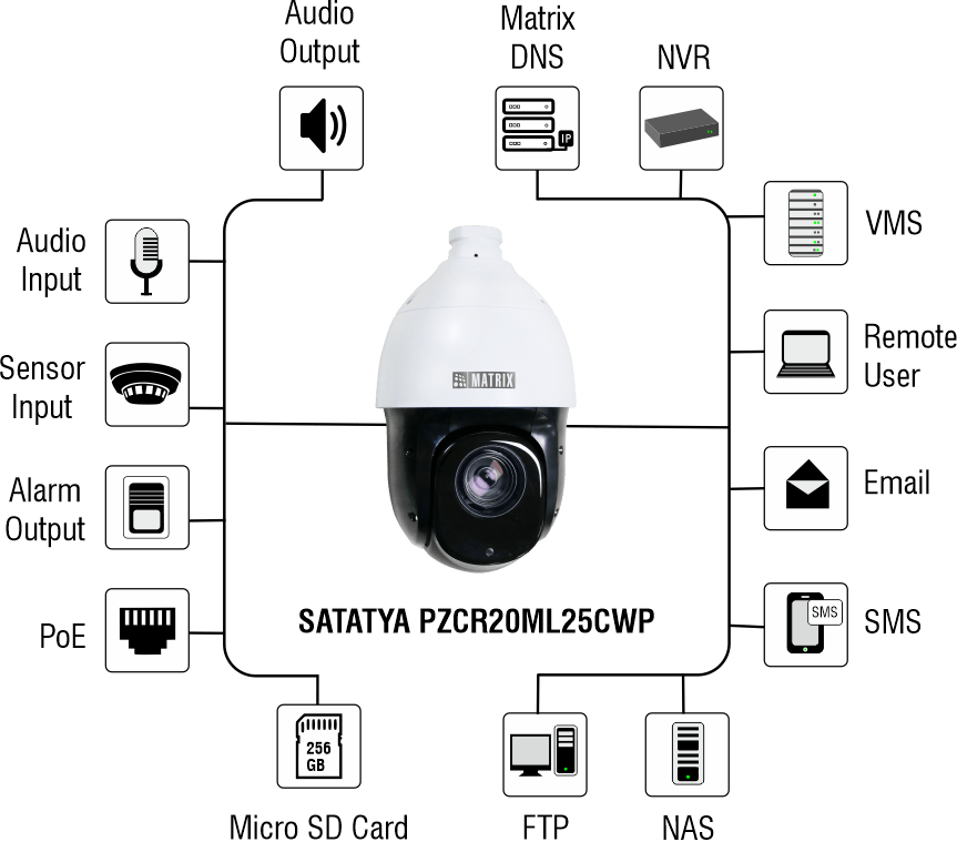 Matrix Pan Tilt and Zoom (PTZ) 2MP IR Dome PTZ Camera with 25x Zoom are designed for 360° Surveillance. This unique ability of panning, tilting and zooming of the camera allows for better coverage, especially in large areas.