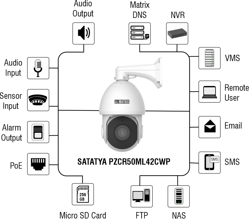 Matrix Pan Tilt and Zoom (PTZ) Network Cameras are designed for 360° Surveillance. This unique ability of panning, tilting and zooming of the camera allows for better coverage, especially in large areas.
