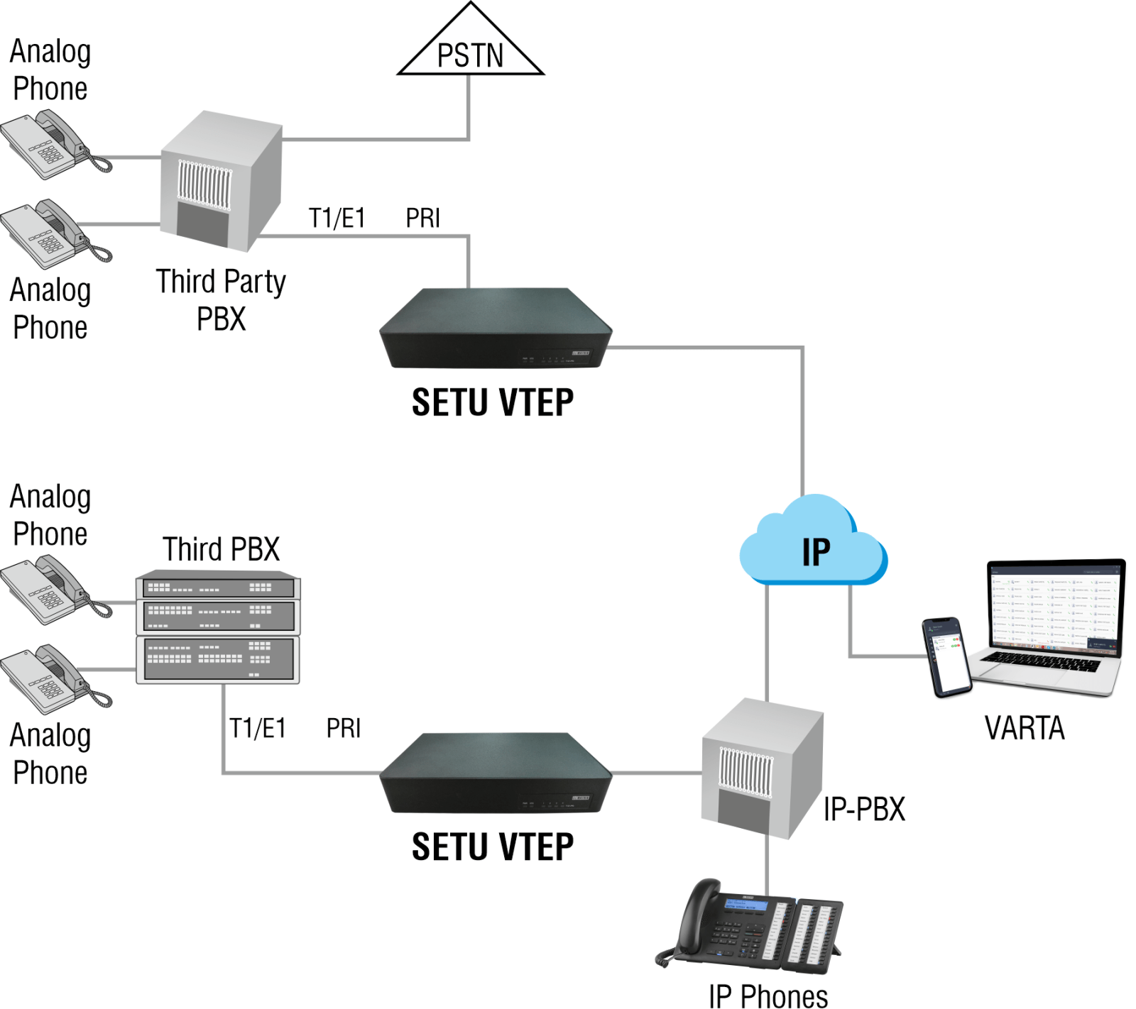 Addressing one such advancement concerning fixed ISDN lines, we proudly bring forth SETU VTEP 4P/3P/2P/1P – Next Generation Multiport VoIP-PRI Gateway. The SETU VTEP Multiport VoIP-PRI gateway supports PRI protocol and adopts a standard T1/E1 trunk interface and provides a smooth transition by enabling direct routing of calls between the fixed-line ISDN and the cost-effective IP networks for capitalizing on low-cost VoIP telephony.