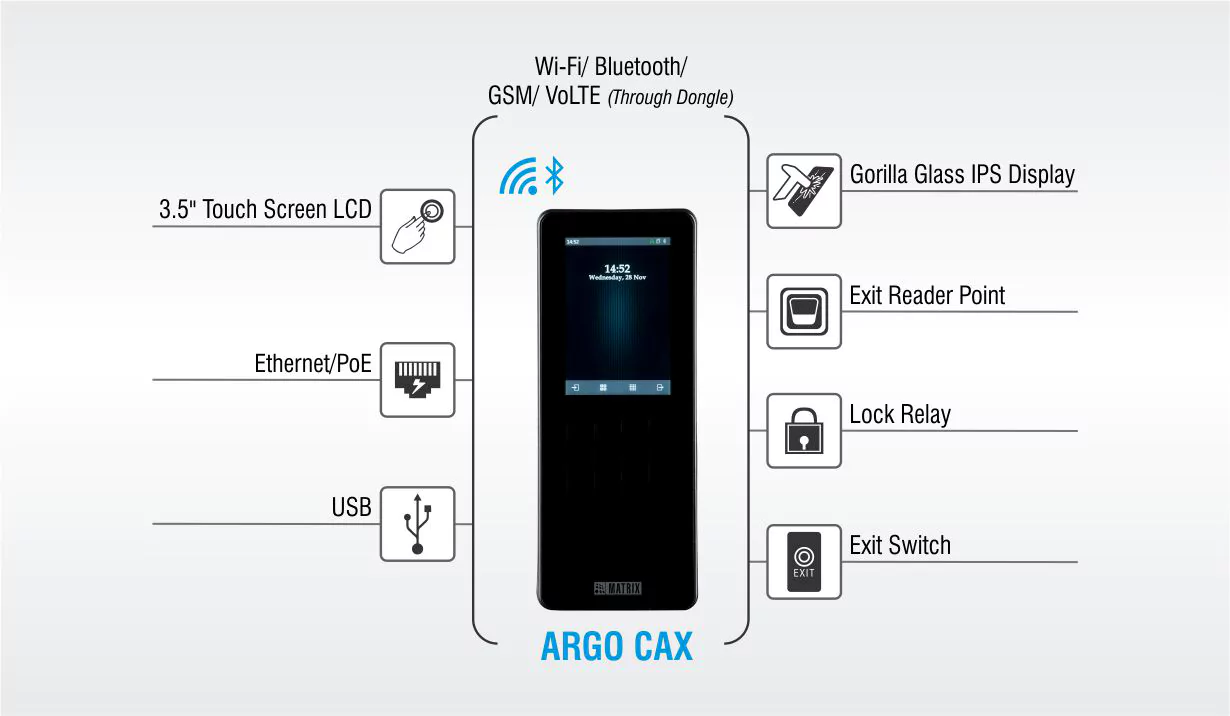 The Performance and Elegance Redefined – COSEC ARGO CAM , with MiFare Classic card module, is an universal device for multiple applications such as Access Control, Time-Attendance, Cafeteria management and Job Processing & Costing that removes the need of dedicated hardware for diverse solutions.