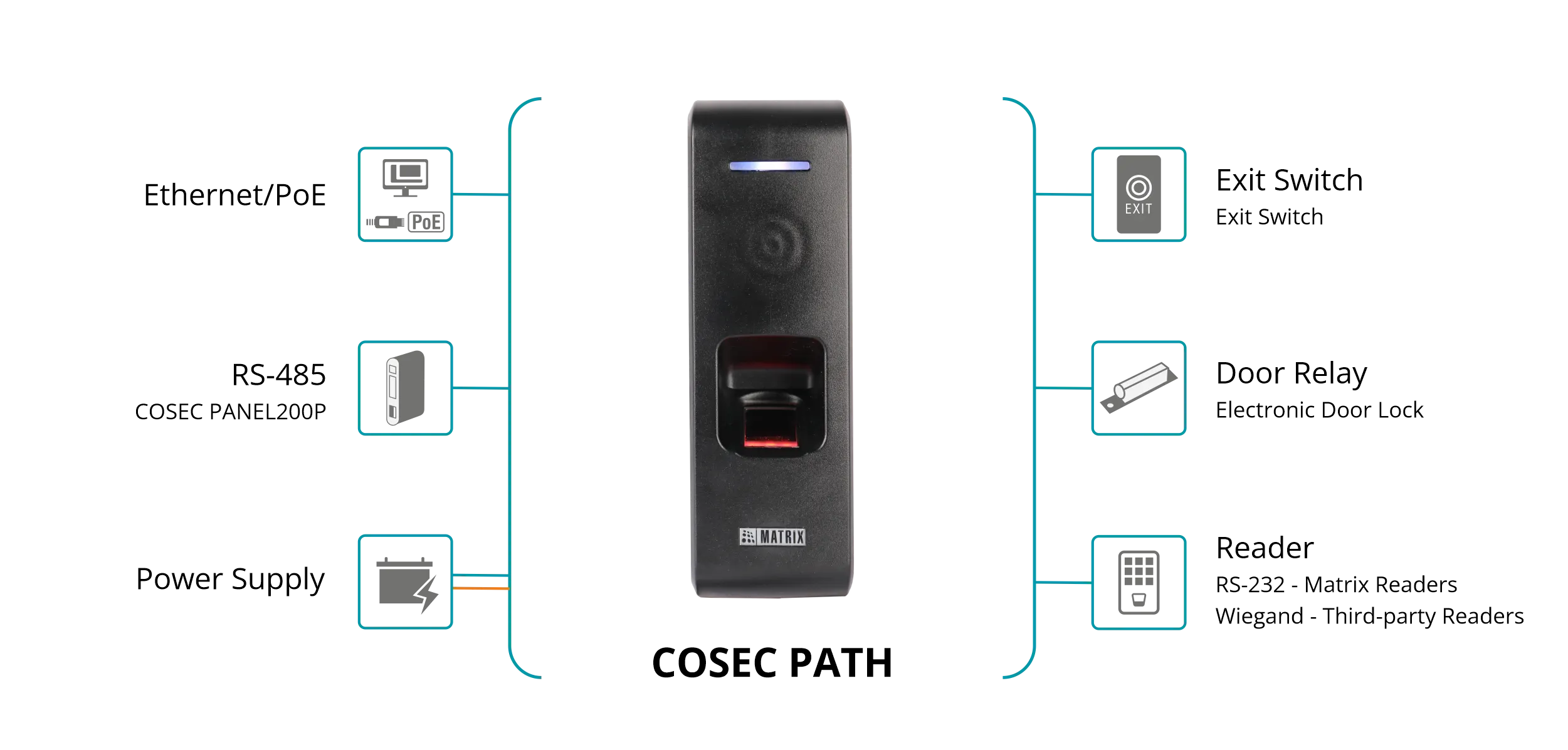 COSEC PATH DCFI, Finger and HiD iClass Card Based Compact Biometric Door Controller is a compact biometric door controller designed for modern organizations with fingerprint as its foremost credential. Supporting multiple credentials such as Fingerprint, Bluetooth® and RFID cards these controllers fulfill the time-attendance and access control needs of modern organizations. In particular, HID iClass cards are used for RFID authentication. Next, multiple connectivity options such as WiFi, Bluetooth®, PoE ensure flexibility in operations. The IP65 design delivers a consistent performance even in harsh weather conditions.