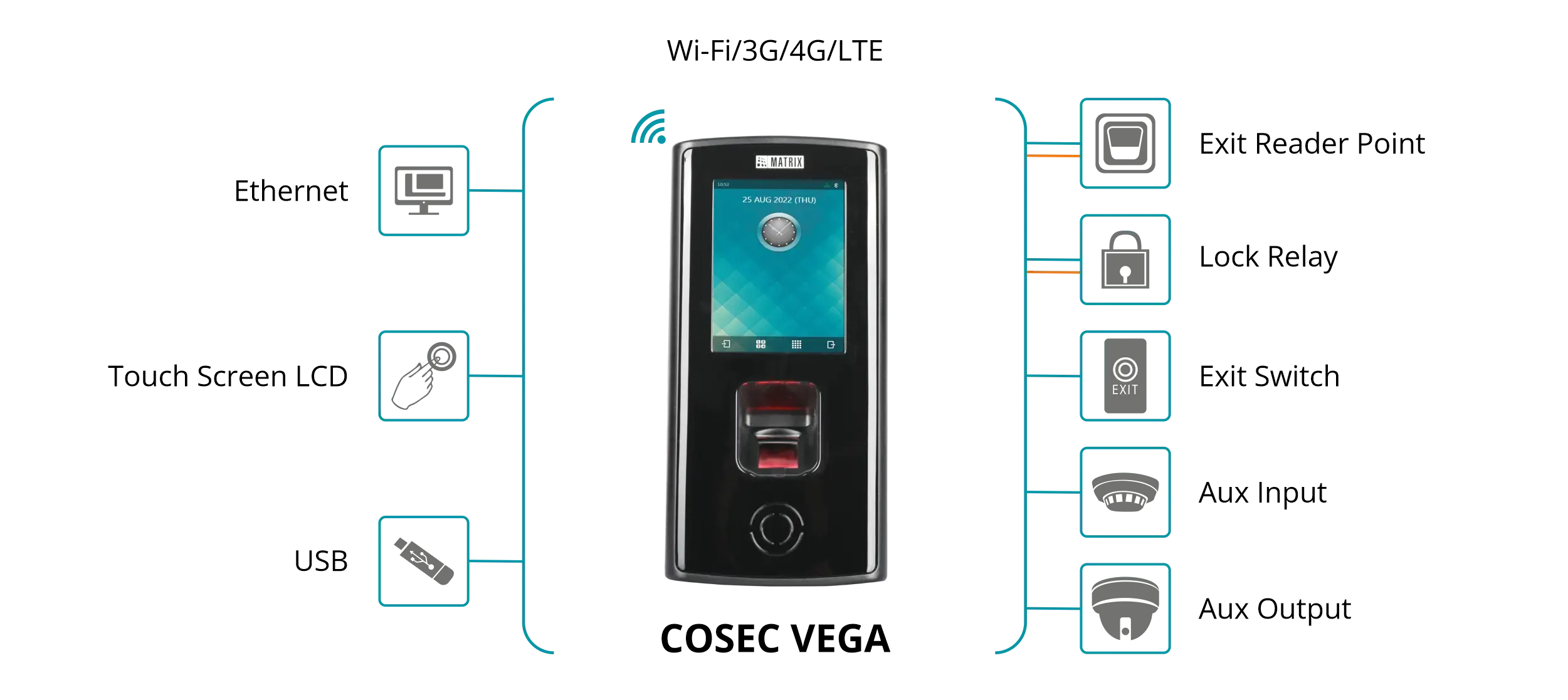 COSEC VEGA FAM, Finger and MiFare Card Based Biometric Door Controller from VEGA series, is specifically built for demanding enterprise to meet the functional needs of an organization’s employee time tracking system along with access control applications. The device offers unique advantages in terms of connectivity, technology, usage environment and ease of use. IP65, PoE, touchscreen and wireless connectivity offer foolproof Access Control and Time-Attendance solutions for organizations. With MiFare Classic Card module alongside biometrics, COSEC VEGA FAM gives the best for organizations along with biometric credentials.